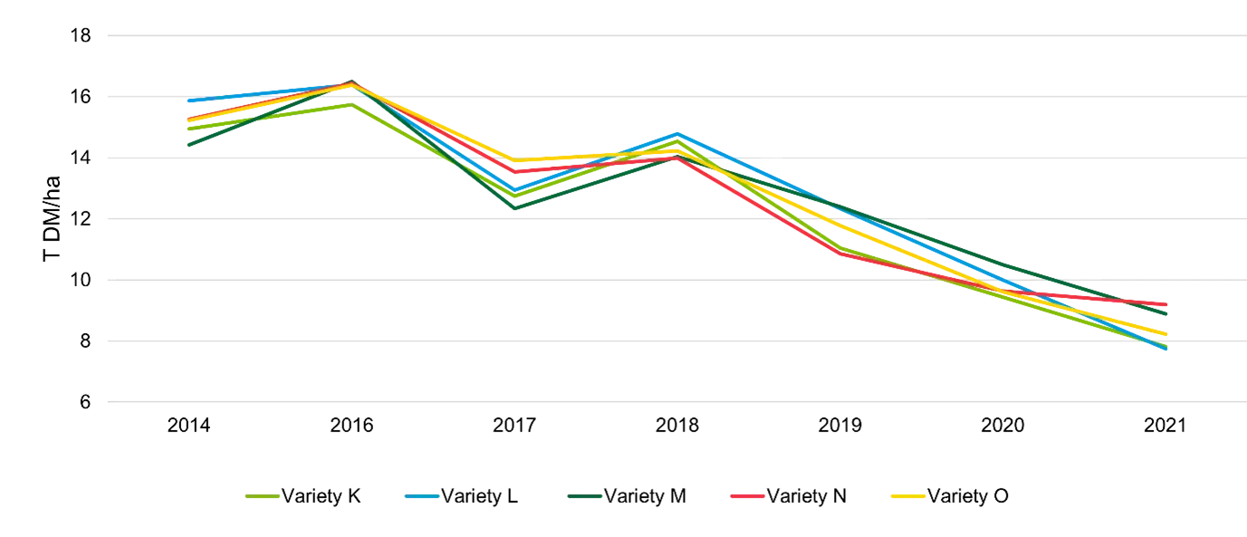 Change in DM yield of perennial ryegrass varieties over time